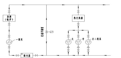 注:大、中、小三种二级泵均为工频运行,由现场或远程手动控制,亦可以各站热交换器的二次水出口温度为标准温控点实施自动控制按需分别开启或关闭大、中、小其中各一台水泵。