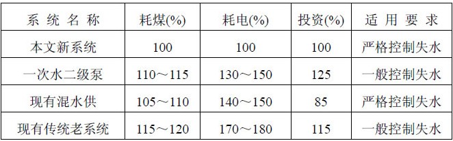 3.3 由于现有在用的混水供系统采取高压一次水掐阀门调节混水比,一是增加了水泵无效电耗,二是很不易调节合适的混水比和各热站的一次水分配。就必然存在前后差异和局部不热老问题,所以为了解决此均匀问题至少多消耗一次热源水510%,等于多耗了同等量的煤和电。尤其锅炉房或首站中,仍采用高扬程大功率热源循环水泵,其水泵无效电耗高、噪声大,工程前期面积不到位时用不了,而今后如增扩些面积就不够用,又必须换成更大的泵。所以说现有在用的混水供系统还是没有摆脱解决这一公认的、历来困惑着广大业内人士的传统头痛问题。另外现有相关资料中推出的混水供方案,经理论分析发现,其所设计的加压混水泵产生的无效电耗大的惊人,至少比本文混水供系统多用电约30%不说,混水比也和现有在用的混水供系统一样不易调节,故浪费热源多耗煤的状况同样存在。故本文作者认为完全没有工程实际应用的可行性。以下针对现有的新系统和传统老系统归纳列表估算对比: