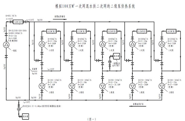 3.1 与现有一次网二级泵系统比,一次水一级泵的设置形式和调节方法是完全一致的。而二级泵的配置扬程还可低810m 可降一个电机档次,另二次网混水循环泵可低1015m 扬程,降低近2 个电机档次。凭这二项明显可比现有单纯二级泵系统在已节电的基础上再节省用电25%以上。