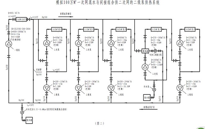4.6 本文系统更适合新建或准备新建的供热网,新建小区二次网是更不应该再存在老小区这些传统失水老问题了。所以考虑到在整个供热网中若还有一时解决不好失水问题的老区域,可以因地制宜地根据各单位的具体情况,按(图二)做成有换热器组合供二次网的二级泵供热系统。也就是若失水能控制在0.15%以内的二次网按(图一)做,暂时若还达不到此条件的二次网按(图二)做。灵活机动,一切存在的现实疑虑和问题都能迎刃而解。