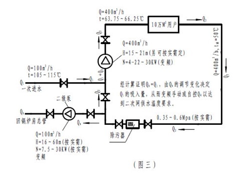 2.2 本文系统的混水供,从名称上看似乎与现有在运行的或以往相关资料中推荐的一样,而实质上和循环流程结构等完全不一样。而是采取无极可调至趋向零压力的一次热源水进入二次网混水循环泵的吸入支管中与同时进入的二次网回水进行负压端混合,通过这二次网混水循环泵将混水全开放地送入二次网,不需掐调出口阀门,保证了最小阻力状态,如二次网对择取混水热量有变化时,可变频调节二级回水接力泵的工况回水量Q4(见图三),就会相应改变一次热源水的吸入量Q1,始终可保持Q4=Q1,达到一次水供回循环水平衡。既满足了热用户的需要又获得了最佳节能效果。这是现有在运行的和资料中介绍的混水供系统都做不到的。如现有在运行的混水供系统虽然也不用换热设备等减小了二次网局部阻力1012m 似乎相同,但由于调节混水比采取掐阀门手段,势必造成水泵的压头损失,使得不用换热设备省下的1012m 阻力大打折扣。现有相关资料中介绍的混水供系统,经客观分析和研究,明显可见还存在大量的水泵无效电耗。因此本文推荐的混水供系统至少可比以上现有的二种混水供系统可再节电约30%