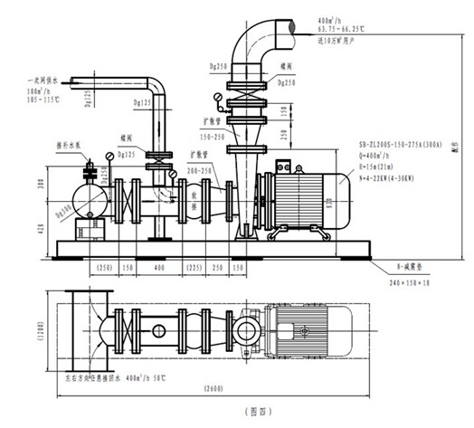 5.7 二次网混水循环泵机组可按(图四)的结构形式除水泵外自行配置接管,也可按图的要求向专业厂订购图四机组。